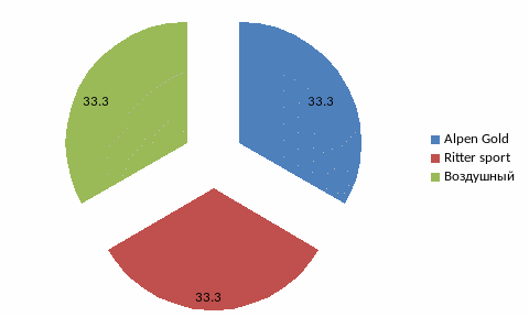 По данной таблице видно что ассортимент и количество брендов очень маленький. Всего брендов 5 и количество видов 18. Из них распространенные «AlpenGold», «Rittersport» и «Milka» каждый из них составляет 22,2% от общего ассортимента. «Воздушный» и «Аленка» в количестве 3 видов с уд.весом 16,7%.