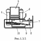 Более надежными являются герсиконы (рис.1.3.5), у которых подвижный 8 и неподвижный 7 контакты также помещены в герметическом корпусе 10, заполненном инертным газом. В герсиконе предусмотрены магнитные полюса 4 и 6, которые вместе с контактной пружиной 9 и катушкой управления 5 образуют замкнутую магнитную цепь. Это позволяет избежать влияния внешних магнитных полей.