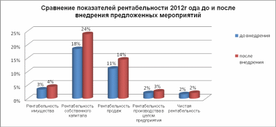 Для более наглядного сравнения на рисунке 6 представлено сравнение показателей рентабельности 2012 года до и после внедрения предложенных мероприятий.