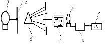 1 – отражатель, 2 – источник света, 3 – светофильтр, 4 – подвижная щель, 5 – фотоэлемент сравнения, 6 – рабочий фотоэлемент