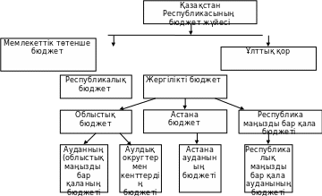 Қазақстан Республикасы мемлекеттік бюджетінің басты бөлігі республикалық бюджетте шоғырланған.Республикалық бюджет — бұл салықтық және басқа да түсімдер есебінен қалыптастырылатын және орталық мемлекеттік органдардың, оларға ведомстволық бағынышты мемлекеттік мекемелердің міндеттері мен функцияларын қаржымен қамтамасыз етуге және мемлекеттік саясаттың жалпы республикалық бағыттарын жүзеге асыруға арналған орталықтандырылған ақша қоры.Жергілікті бюджет (әкімшілік-аймақтық бірліктердің бюджеттері)—облыстық бюджет, республикалық маңызы бар қаланың, астананың бюджеті, аудандардың (облыстың маңызы бар қаланың) бюджеті.Бюджет жүйесінің жұмыс істеуі бюджеттердің әр түрлі деңгейлерінің өзара байланысына негізделеді және оларды жоспарлау, әзірлеу, қарау, бекіту, атқару, бақылау тәртібімен, сондай-ақ республикалық және жергілікті бюджеттердің атқарылуы туралы есеппен қамтамасыз етіледі.ҚР-да мынадай деңгейдегi бюджеттер: республикалық бюджет; облыстық бюджет, республикалық маңызы бар қала, астана бюджеттерi; аудан (облыстық маңызы бар қала) бюджетi бекiтiледi, атқарылады және дербес болып табылады.Облыстық бюджет, республикалық маңызы бар қала, астана бюджеттерi, аудан (облыстық маңызы бар қала) бюджетi жергiлiктi бюджеттерге жатады.Қазақстан Республикасында талдамалы ақпарат ретiнде пайдаланылатын және бекiтуге жатпайтын мемлекеттiк және шоғырландырылған бюджет, облыстардың бюджетi жасалады.Мемлекеттiк бюджет өз араларында өзара өтелетiн операциялар ескерiлместен, республикалық және жергiлiктi бюджеттердi бiрiктiретiн, мемлекеттiң орталықтандырылған ақша қоры болып табылады.Шоғырландырылған бюджет өз араларында өзара өтелетiн операциялар ескерiлместен, республикалық бюджеттi, облыстардың бюджетiн республикалық маңызы бар қала, астана бюджетiн және Қазақстан Республикасының Ұлттық қорына бағытталатын түсiмдердi бiрiктiретiн мемлекеттiң орталықтандырылған ақша қоры болып табылады.Облыс бюджетi өз араларында өзара өтелетiн операциялар ескерiлместен, облыстық бюджеттi, аудандар (облыстық маңызы бар қалалар) бюджетiн бiрiктiретiн орталықтандырылған ақша қоры болып табылады.Осы Кодексте айқындалған түсiмдер есебiнен қалыптастырылатын және орталық мемлекеттiк органдардың, оларға ведомстволық бағынысты мемлекеттiк мекемелердiң мiндеттерi мен функцияларын қаржылай қамтамасыз етуге, сондай-ақ мемлекеттiк саясаттың жалпы республикалық бағыттарын iске асыруға арналған орталықтандырылған ақша қоры республикалық бюджет болып табылады.Осы Кодекспен айқындалған түсiмдер есебiнен қалыптастырылатын және облыстық деңгейдегi, республикалық маңызы бар қаланың, астананың жергiлiктi мемлекеттiк органдарының, оларға ведомстволық бағынысты мемлекеттiк мекемелердiң мiндеттерi мен функцияларын қаржылай қамтамасыз етуге және тиiстi әкiмшiлiк-аумақтық бiрлiкте мемлекеттiк саясатты iске асыруға арналған орталықтандырылған ақша қоры облыстық бюджет, республикалық маңызы бар қала, астана бюджеттерi болып табылады.