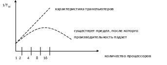 Желательно, чтобы наблюдался линейный рост производительности системы. Линейный рост производительности системы невозможен из-за конфликтов, которые возникают из-за обращения процессоров к ресурсам (память и пр.)