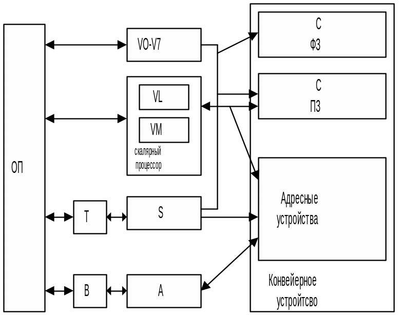 VO–V7 – векторные регистры, каждый из которых содержит 64 регистра по 64разряда каждый; VL – регистр длины вектора; VM – регистр маски; S – набор скалярных регистров; T – промежуточные регистры – буферные регистры между ОП и скалярными регистрами. A – набор адресных регистров; B – промежуточные регистры между ОП и адресными регистрами. (VL и VM) – входят в состав скалярного процессора (подготовка работе, ДШКОП). Конвейерное устройство – до 12 ступеней (для операций с плавающей запятой, с фиксированной запятой, обработки адресов – свои устройства). Такая структура обеспечивает высокий параллелизм при выполнении операций.