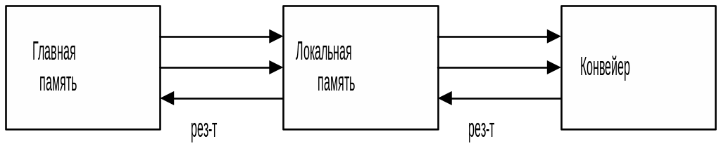 Взаимодействие локальной памяти с главной памятью и с конвейером: