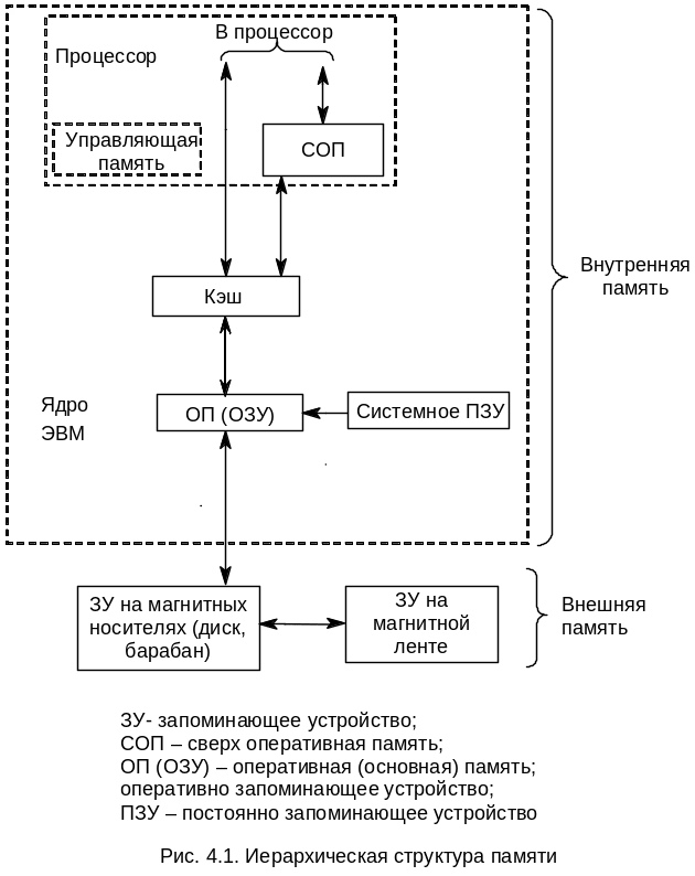 Кроме того, развитие программного обеспечения и расширение круга задач, решаемых на ЭВМ, требовали постоянного увеличения объема ОП. Между тем известно, что на всем протяжении развития ЭВМ требования к емкости и быстродействию ЗУ были противоречивы – чем выше быстродействие, тем технически труднее и дороже обходится увеличение емкости. Необходимость поддержания стоимости памяти ЭВМ на приемлемом уровне, а также множество технических проблем, связанных с построением быстродействующих ЗУ большого объема, и привели в процессе эволюции к созданию иерархической структуры памяти современной ЭВМ.