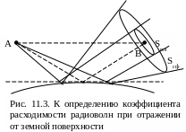 Пусть приемная и передающая антенны расположены в точках A и B и подняты на высоты соответственно h1 и h2 над гладкой сферической Землёй с радиусом RЗ 6378 км (рис. 11.1). Если соотношение между h1, h2, RЗ таково, что первая зона Френеля не достигает земной поверхности, то возможно прямолинейное распространение радиоволн между точками A и B. Если зона перекрывается земной поверхностью, то сферичность Земли является препятствием, за которое радиоволна может распространяться только путем дифракции. Поле в этом случае оказывается сильно ослабленным.