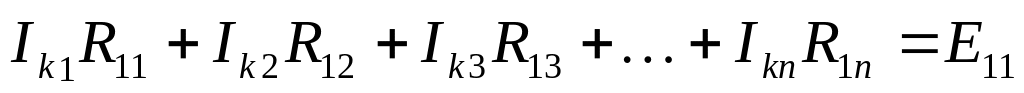 2) Составляются m(n1) уравнений по 2-му закону Кирхгофа для выбранных контуров-ячеек с контурными токами Iк1, Iк2, Iк3. В уравнениях учитываются падения напряжений как от собственного контурного тока, так и от смежных контурных токов.
