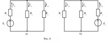 На рис. 6а представлена схема цепи для определения частичных токов от источника ЭДС Е1, а на рис. 6б от источника ЭДС Е2.
