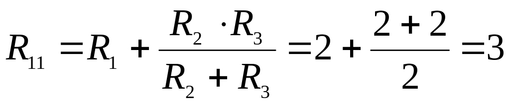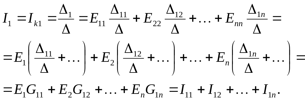 Здесь G11 –входная проводимость ветви 1, G12, G13, …, G1n– взаимные проводимости между 1-й и остальными ветвями, I11 = E1G11 – частичный ток в ветви 1 от источника ЭДС E1, I12 = E2G12, …, I1n = EnG1n – частичные токи в ветви 1 от источников ЭДС E2,…, En.