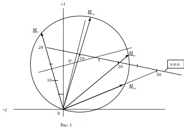 Вдоль линии переменного параметра откладывают текущее значение параметра “n” соединяют точку с началом вектора М0 (началом координат) и продолжают прямую линию до пересечения с дугой окружности. Искомый вектор М соответствует отрезку от начала координат до точки пересечения прямой линии с дугой окружности, при этом модуль вектора равен длине отрезка в масштабе mм, а начальная фаза вектора – углу между вещественной осью +1 и напрвлением вектора.
