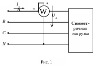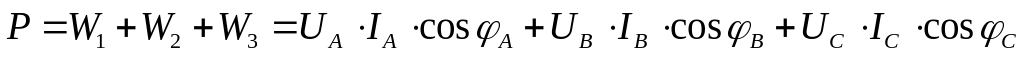 Для измерения активной мощности в четырехпроводных трехфазных цепях (при наличии нулевого провода) применяется схема с тремя приборами (рис. 2), в которой производится измерение активной мощности каждой фазы в отдельности, а мощность всей цепи определяется как сумма показаний трех ваттметров:
