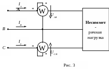 Для измерения активной мощности в трехпроводных трехфазных цепях (при отсутствии нулевого провода) применяется схема с двумя приборами (рис. 3).
