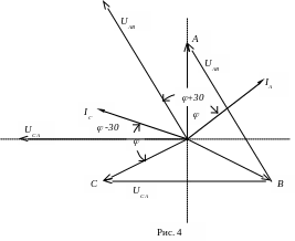 На рис. 4 показана векторная диаграмма токов и напряжений для симметричной нагрузки. Из диаграммы следует, что показания отдельных ваттметров могут быть определены по формулам: