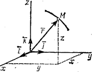 Положение точки можно непосредственно определять ее декартовыми координатами х, у, z (рис.3), которые при движении точки будут с течением времени изменяться. Чтобы знать закон движения точки, т.е. ее положение в пространстве в любой момент времени, надо знать значения координат точки для каждого момента времени, т.е. знать зависимости