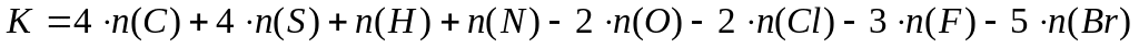 n(C), n(S), n(H), n(N), n(O), 2 n(Cl), n(F), n(Br) – число атомов углерода, серы, водорода, азота, кислорода, хлора, фтора и брома в молекуле вещества.