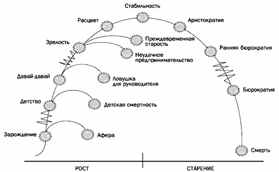 В теории И. Адизеса особое внимание уделяется рискам организации на стадиях ее становления. Их можно свести к следующим: «смерть во младенчестве», «ловушка основателя», «несостоявшийся предприниматель» и «преждевременное старение». Первая может проявить себя на самой ранней стадии развития организации, когда все зависит от ее основателя, его способностей и самоотдачи, а также от притока средств в организацию. Далее возникает необходимость в делегировании полномочий и создании административной подсистемы, так как основатель сам уже не справляется со всеми функциями. От того, насколько успешно он это осуществит, зависит дальнейшее развитие компании. Наконец, последние две ловушки относятся к периоду, когда бизнес перерастает основателя, и ему приходится делать выбор: либо децентрализовывать управление, либо нанимать профессиональных управляющих, либо продавать свой бизнес. В любом случае он должен потерять полностью или частично контроль над своим предприятием. [5, 13 с.]