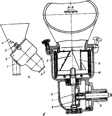 Шкально-гирные весы. В торговле наиболее распространены сотенные шкально-гирные весы. Весы РП-500Г13 с качающейся платформой и коромыслом, опирающимся на стойку, имеют металлическую или деревянную раму, в углах которой на перекладинах укреплены стальные подушки. На подушки опираются опорные призмы 11 большого 1 и малого 2 подплатформенных рычагов. На грузоприемные призмы большого и малого рычагов надевают подвески 4 с заплечниками. На подвески опираются вилки, укрепленные на платформе весов, а следовательно, и платформа. Посередине большого рычага укреплена призма, на которую надевается серьга 3, соединяющая большой и малый подплатформенные рычаги. Коромысло весов опирается на стойку. Малое плечо б коромысла с помощью тяги 5 и серег соединено с концевой призмой большого подплатформенного рычага. На малом плече на резьбу укреплен массивный тарировочный груз 9, а на гиредержателе 10 — небольшая тарировочная камера. На коромысле имеется несъемная передвижная гиря 8 и шкала, а на конце большого плеча на грузоприемной призме подвешен гиредержатель. Весы имеют указатель равновесия и арретир 7, запирающий коромысло весов.