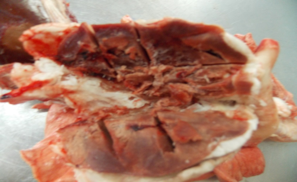 Осмотр сердца. Вскрывали околосердечную сумку. Осматривали состояние перикарда и эпикарда. Затем по большой кривизне разрезали стенку правого и левого отделов сердца, с одновременным вскрытием желудочков и предсердий. Осматривали миокард, состояние эндокарда, клапанов сердца и крови. Проводили несколько продольных и поперечных несквозных разрезов мышц сердца (на цистицеркоз).