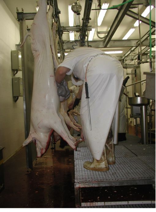 Перед нутровкой свиных туш рабочий разрезает грудную кость по хрящевым сращениям, подрезает мускулы живота по белой линии. После вскрытия брюшной полости у свиноматок отделяется матка, разрезается лонное сращение и выхватывается жировая ткань. Далее вырезают гузенку, после чего отжимают содержимое гузенки внутрь кишки, из туши извлекается желудочно-кишечный тракт, надрезаются края диафрагмы у самых стенок грудной клетки и извлекается ливер. Все внутренние органы укладываются на стол нутровки.[4]