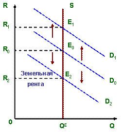 Спрос на землю неоднороден. Он включает 2 элемента: сельскохозяйственный и несельскохозяйственный спрос. Кривая спроса на землю будет иметь отрицательный наклон. Это связано с тем, что по мере вовлечения земли в хозяйственный оборот нужно переходить от лучших по плодородию земель к средним и худшим.