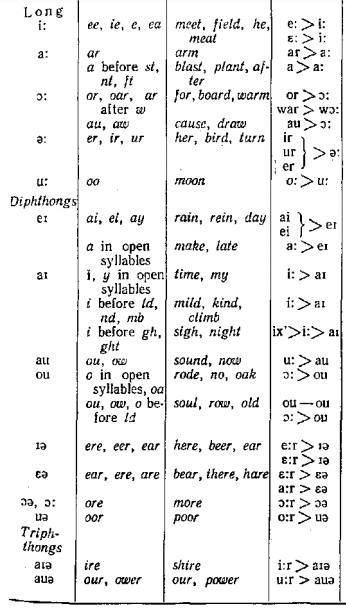 In Early ME the sounds [j] and [γ] between and after vowels changed into [i] and [u] and formed diphthongs together with the preceding vowels, e.g. ME day [dai].