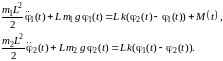 Осциллятор представляет собой два маятника, металлические однородные стержни одинаковой длины, связанные пружиной. При выведении системы из равновесия маятники совершают сложные плоские движения, которыми необходимо управлять. Осциллятор имеет единственный управляющий моментный привод МП, установленный в точке подвеса А первого маятника. Линеаризованная математическая модель осциллятора при малых углах отклонения маятников имеет следующий вид: