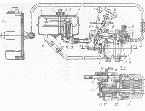 При повороте влево золотник 18 смещается вперед, направляя масло в переднюю полость А цилиндра, т. е. под поршень. Полость. Б в это время сливным шлангом 6 соединяется с бачком. Под давлением масла и усилия, создаваемого водителем, поршень перемещается вверх и своей рейкой поворачивает сектор и далее через рулевую сошку и рулевые тяги он повернет колеса автомобиля влево (положение III). Следовательно, при работающем двигателе и исправном гидравлическом усилителе для поворота автомобиля водителю не приходится затрачивать большие усилия, что повышает его работоспособность и надежность рулевого управления. Однако это усилие может оказаться настолько незначительным, что водитель может потерять «чувство» дороги. Чтобы этого не случилось, в гидравлическом, усилителе пространство между плунжерами сообщается с нагнетательной полостью. С повышением сопротивления повороту колес для перемещения поршня 10 требуется приложить большее усилие, поэтому давление масла в нагнетательной полости возрастает. Под этим давлением плунжеры 22 сильнее прижимаются к кольцам подшипников и для сдвига, золотника требуется приложить большее усилие, что и вызывает «чувство» дороги. При неработающем двигателе насос не подает масло в гидравлический усилитель и рулевой механизм работает как обычный механический. В этом случае водителю приходится затрачивать значительные усилия на управление автомобилем.