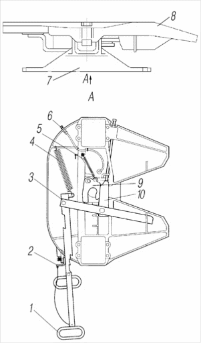 1-рукоятка управления расцепкой; 2-предохранитель саморасцепки; 3-рычаг; 4-пружина; 5-пружина; 6-магистраль; 7-кронштейн; 8-седло; 9-крюк запорный; 10-задвижка запорная