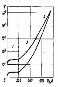 Видно, что в области 2 амплитуды импульсов вырастают в 10…100 раз и при этом сохраняется пропорциональность между величинами импульсов и начальной ионизацией. Эту область называют областью работы пропорционального счетчика. При дальнейшем увеличении напряжения пропорциональность нарушается, а затем амплитуда импульса оказывается независящей от первичной ионизации. Рассмотрим механизм газового усиления и дадим качественные объяснения поведения вольтамперной характеристики.