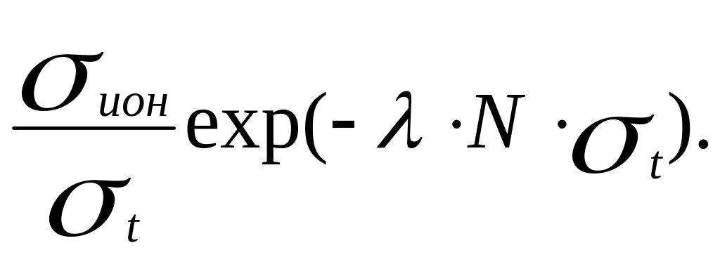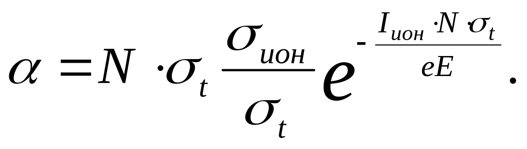 Оценим, какова вероятность ионизации на единице пути. Пусть взаимодействие электронов с атомами характеризуется полным сечением взаимодействия σt, а вероятность ионизации – сечением ионизации σион. Для того чтобы был возможен процесс вторичной ионизации, электрон должен приобрести энергию выше потенциала ионизации Iион. Такую энергию электрон может приобрести в электрическом поле Е, если пройдет путь без соударений х ≥ λ = Iион/e·E. Вероятность электрону пройти путь х и ионизовать атом на пути dx равна σион·N·ехр(-x·N·σt)dx. Интегрируя по х от λ, (при х < λ, энергия электрона еще мала для вторичной ионизации) до ∞, получаем вероятность вторичной ионизации при пробеге электроном пути, большего λ: