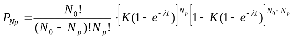 При регистрации Np распадов радиоактивных ядер из имеющегося числа N0 может распасться и быть зарегистрировано все число радиоактивных ядер N0, имеющихся в начальный момент времени, с одной и той же вероятностью Р и может быть не зарегистрировано с вероятностью Q. Вероятность того, что будет зарегистрировано Np распадов ядер описывается формулой: