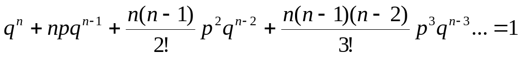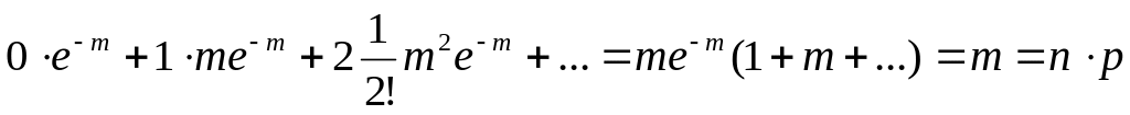 Заметим, что сумма, стоящая в скобках, равна enp, а всё выражение равно единице (e–np · enp). Напомним, что соответствующие члены ряда представляют собой вероятности того, что в последовательности из n испытаний интересующее нас событие произойдёт 0, 1, 2, 3, … раз. Сумма всех вероятностей, естественно, должна быть равна единице.