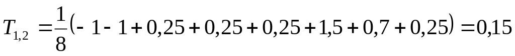 Поясним, как было получено выражение в скобках. Производим сравнение двух сортов по всем модальностям. Так при сравнении сорта 1 и 2 по модальности А1 (зеленая) наблюдается несовпадение (А1 у 1-го сорта и а1 у 2-го. Следовательно, записываем «–1», поскольку, всякому несовпадению двух объектов по модальностям приписывается один и тот же вес «– 1». Далее сравниваем модальности А2 (антоциановая). Здесь также обнаруживается несовпадение (а2 у 1-го сорта и А2 у 2-го). Значит, записываем следующее слагаемое тоже «–1». При сравнении сорта 1 и 2 по модальности А3 (пестрая) наблюдается совпадение по отсутствию этой модальности (а3 у 1-го сорта и а3 у 2-го). Следовательно, записываем вес по отсутствию данной модальности, который равен 0,25. Аналогично определяются все слагаемые выражения в скобках.