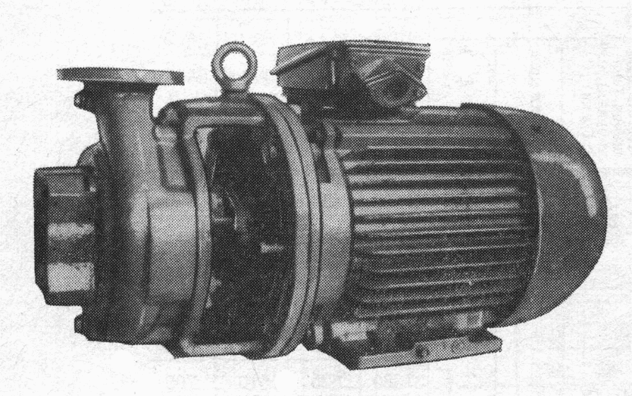 Значительную экономию габаритов и массы обеспечивают моноблочные насосы, которые монтируются на одном валу с электродвигателем (рис. 5). В таком агрегате электродвигатель выполняется с удлиненным валом, на котором консольно устанавливается рабочее колесо насоса. Корпус насоса крепится посредством фонаря к фланцу электродвигателя.