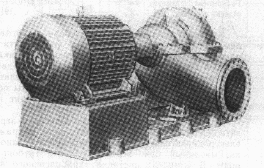 Для создания больших подач применяют центробежные насосы двустороннего входа (рис. 3). Они обеспечивают транспортирование жидкости в интервале подач от 200 до 12500 м3/ч при напоре от 14 до 130 м и температуре жидкости до 85 С. Входной и напорный патрубки этих насосов расположены в нижней части корпуса и направлены горизонтально в противоположные стороны. Такое расположение патрубков, а также горизонтальный разъем корпуса обеспечивают возможность контроля и замены рабочих деталей без снятия насоса с фундамента и без демонтажа двигателя и трубопроводов.