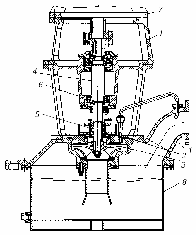 1 – корпус; 2 – вал; 3 – рабочее колесо; 4, 5 – подшипниковые опоры; 6, 7 – сальники