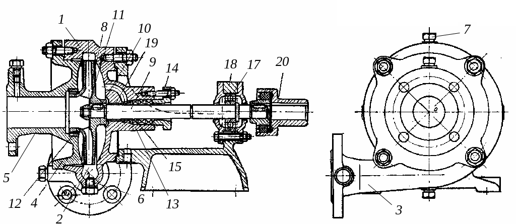 1 – корпус; 2 – спиральная полость; 3 – напорный патрубок; 4 – крышка; 5 – всасывающий патрубок; 6, 7 – пробки; 8 – рабочее колесо; 9 – вал; 10 – шпонка; 11 – гайка; 12 – уплотняющее кольцо; 13 – корпус сальника; 14 – нажимная втулка; 15 – набивка; 16 – кольцо; 17 – шарикоподшипник; 18 – опорная стойка; 19 – втулка; 20 – муфта