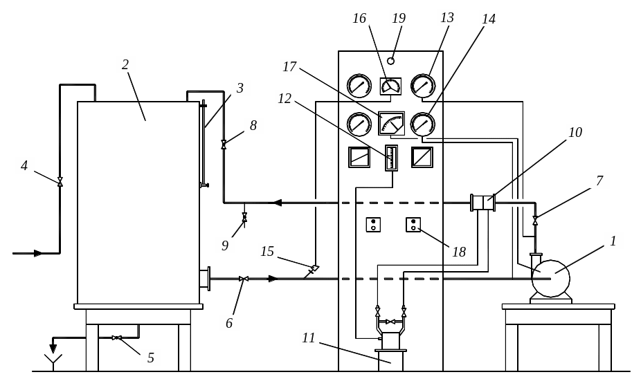 1 – центробежный насос; 2 – емкость; 3 – указатель уровня; 4, 6, 7 – вентили; 8, 9 – краны; 10 – камерная диафрагма; 11 – дифференциальный манометр; 12 – вторичный прибор; 13 – манометр; 14 – мановакуумметр; 15 – термометр сопротивления; 16 – логометр; 17 – ваттметр; 18 – кнопочный пускатель; 19 – контрольная лампа