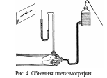 а) механическую, или объемную - исследуемый участок помещают в герметичный сосуд с водой, и вытесненный объем воды соответствует изменениям кровенаполнения (иногда применяется для исследования артерий и вен конечностей в специализированных отделениях) (рис. 4);