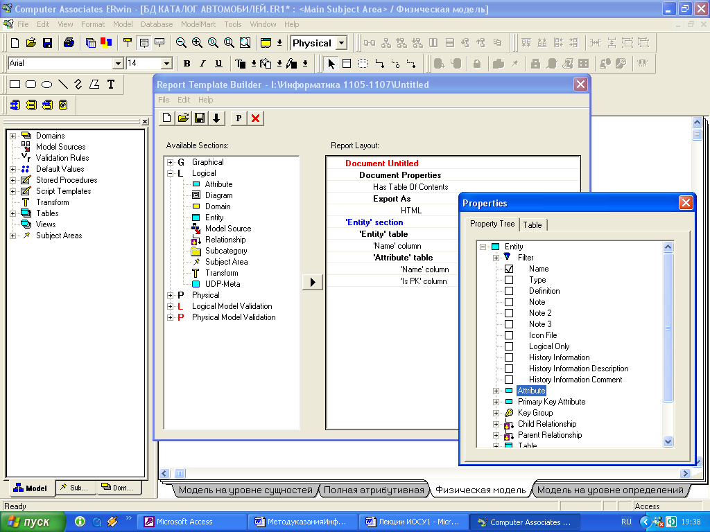 Для определения параметров отчета нажмите кнопку Новый (New). В окне Доступные элементы (Available Sections) (рисунок 22) выберите Логическая модель (Logical) и Сущность (Entity) двойным щелчком мыши или выполните команду Добавить элемент (Add Sections) контекстного меню. В правом окне Структура отчета (Report Layout) появится выбранный элемент. Выделите в правом окне элемент Сущность (Entity Section) и выполните команду Свойства (Properties) контекстного меню. В появившемся диалоговом окне Свойства (Properties) (рисунок 22) укажите необходимые параметры отчета, например, Имена сущности (Entity - Name), Имена атрибутов (Attribute - Name), Первичный ключ (Attribute - Is PK).