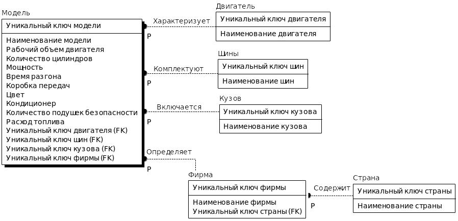 Установите не идентифицирующие обязательные связи (Non-identifying relationship) между таблицами “Страна”-“Фирма”, независимыми (родительскими) таблицами ”Двигатель”, “Шины”, ”Кузов”, ”Фирма” и зависимой (дочерней) таблицей “Модель”, используя команду Не идентифицирующая связь панели инструментов (Erwin Toolbox) и последовательного указания мышью двух связываемых сущностей (рисунок 16).
