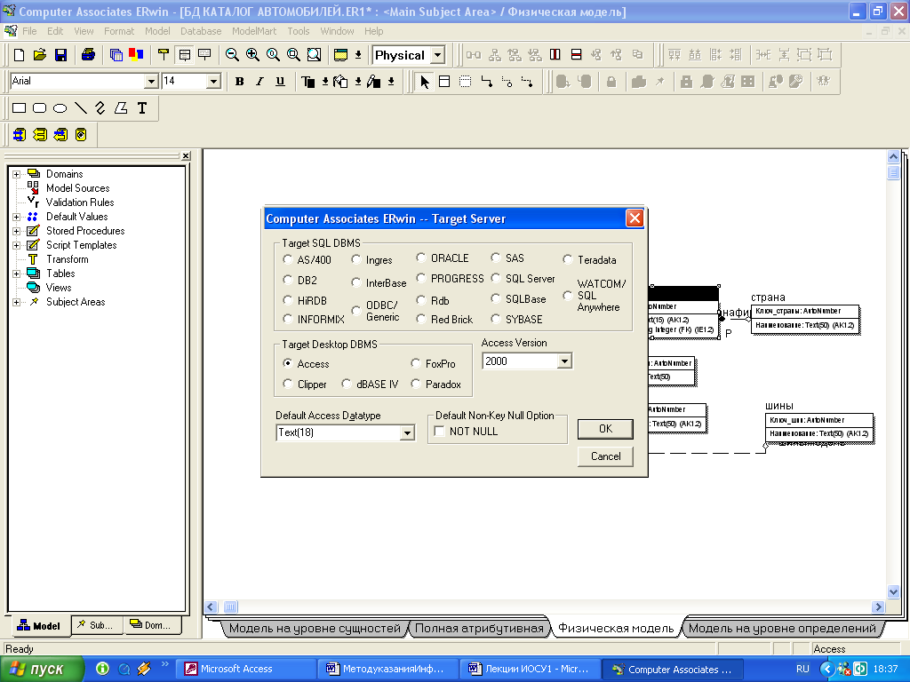 Укажите Тип модели – Логический/Физический. Выберите в списке тип СУБД – Access версии 200/2002/2003. Нажмите кнопку OK.
