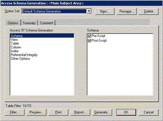 Выберите пункт меню Tools - Forward Engineering - Schema Generation установите параметры формирования физической модели (рисунок 20). Для начала генерации физической модели базы данных в формат выбранной СУБД нажмите кнопку Generate. Для просмотра результатов генерации откройте созданную базу данных в выбранной СУБД Access 2003.