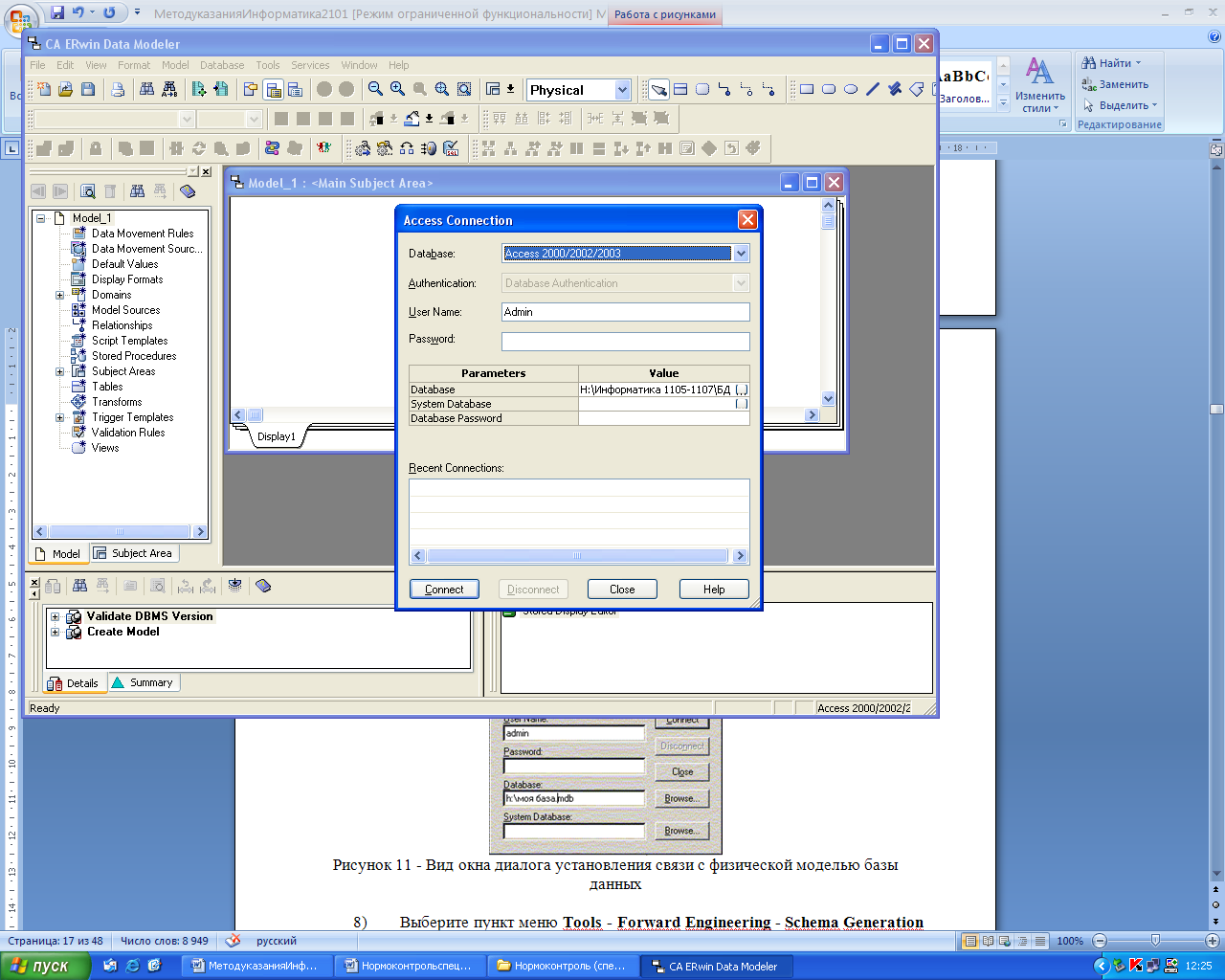 Установите связь с физической моделью базы данных, используя команду пункта главного меню Database - Database Connection (рисунок 19). В диалоговом окне установления связи определите: имя пользователя - имя ADMIN; имя базы, куда будет производиться генерация (имя созданного файла базы в СУБД), для выбора можно воспользоваться кнопкой Browse.