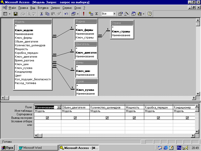 Создайте запросы с параметрами: Поиск характеристик моделей по стране и Поиск характеристик моделей по фирме аналогично вышеизложенному в п.п.1-5 п.3 с условиями отбора Страна-наименование: [Введите страну] и Фирма-наименование: [Введите фирму] соответственно.