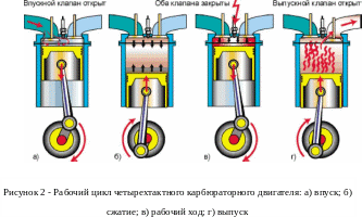 Рабочий цикл четырехтактного карбюраторного двигателя представлен на рисунке 2 и состоит из следующих тактов: