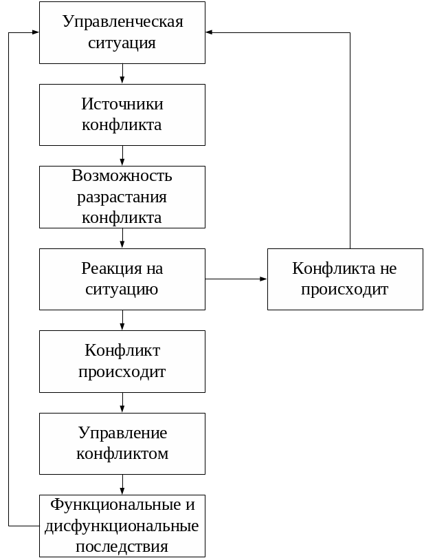 На рис.9.1. представлена модель конфликта как процесса. Из нее видно, что существование одного или более источников конфликта увеличивает возможность возникновения конфликтной ситуации в процессе управления. Однако, даже и при большей возможности возникновения конфликта, стороны могут не захотеть реагировать так, чтобы и дальше усугублять ситуацию. Одна группа исследователей обнаружила, что люди не всегда реагируют на конфликтные ситуации, которые влекут за собой малые потери или которые они считают малоопасными. Другими словами, иногда люди понимают, что потенциальные выгоды участия в конфликте не стоят затрат. Их отношение к этой ситуации выражается следующим: «На этот раз я разрешу ему поступить по-своему».