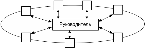 Кольцевая схема представляет собой замкнутую на руководителя линейную схему. Она эффективна в небольших организациях или в подразделениях средних организаций со стабильной продукцией и стабильным рынком. Для кольцевой схемы характерно разделение функциональных обязанностей среди профессиональных работников, а административные остаются у руководителя.