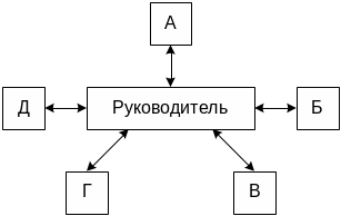 Схема «звезда» представляет собой разветвленную систему линейных отношений. Она рекомендуется при филиальной структуре организации и при необходимости соблюдения конфиденциальности в деятельности каждого составляющего подразделения. Между объектами управления нет внутренних связей. С каждым объектом только руководитель реализует линейные и функциональные связи.