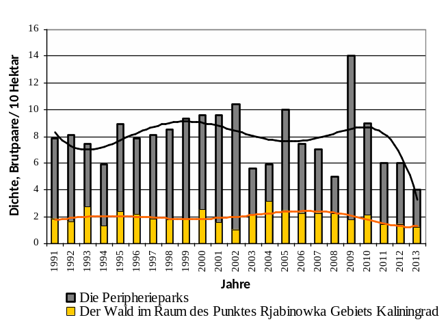 Плотность населения в наиболее густо заселенном городском биотопе (периферийные городские парки - лесопарки) значительно превышает гнездовую плотность черного дрозда в типичном лесном местообитании - в смешанном лесу, расположенном в 12 км от городской черты Калининграда; при этом население птиц в лесном местообитании отличается большей стабильностью, тогда как межгодовые колебания плотности населения в городских парках более значительны (Abb. 3).